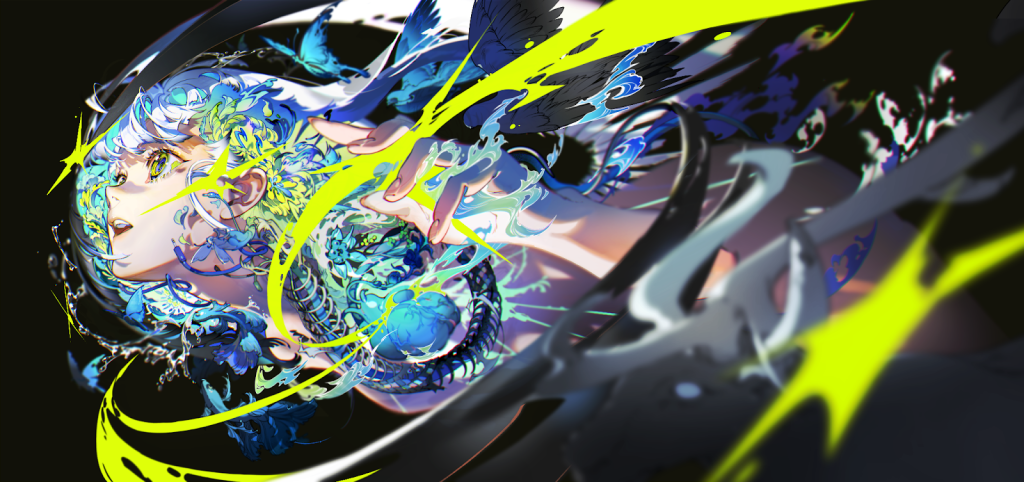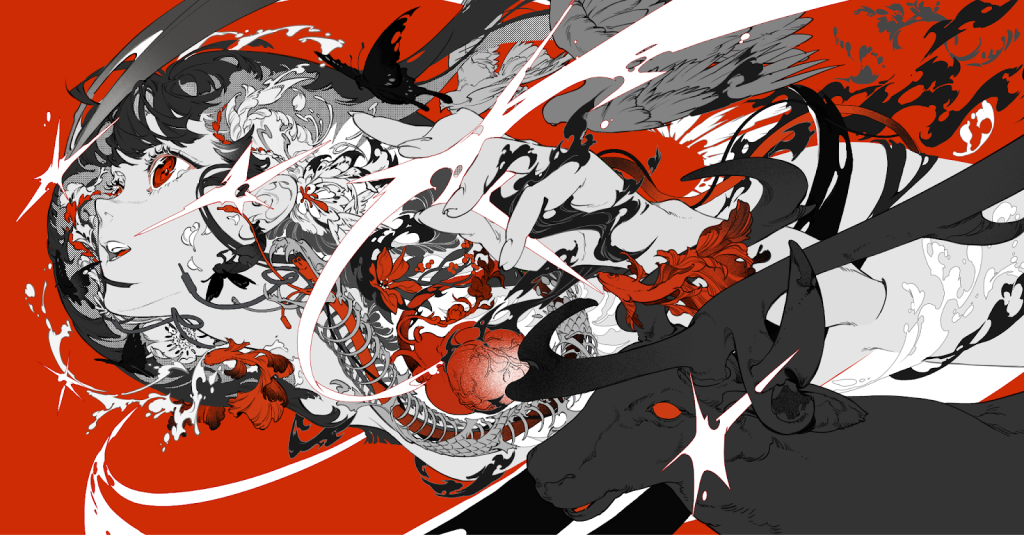 幼少の時に観たアニメーションの変身シーン、登場人物が危機から脱するシーンにも自分を投影していたこともあり、ある状態から違う状態へと変化する過程や、葛藤や苦難を経た先にある成長やカタルシスに惹かれ、それを自分が触れてきたアニメやコミック、イラストレーションの文化の中で培った技法で表現しています。